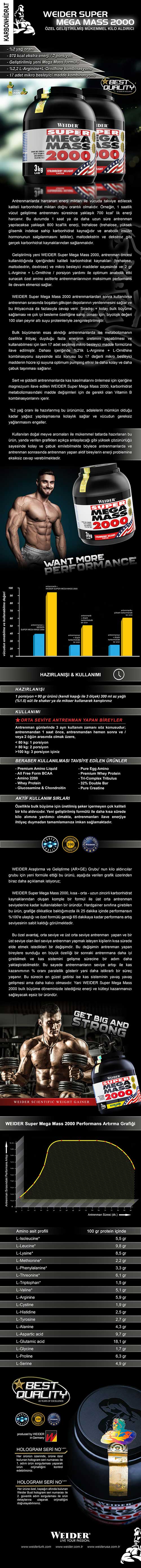 WEIDER Super Mega Mass 2000 düşük yağ oranı ile yağsız kilo alımını ve kas gelişimini destekler. Formülünde bulunan yüksek kalitede karbonhidratlar sayesinde yoğun ve şiddetli antrenmanlar sırasında ihtiyaç duyulan enerjinin sağlanmasına yardımcı olur. İçerdiği whey protein ile kas sistemini besler ve metabolizmanın karbonhidratları kullanma oranını arttırır. WEIDER Mega Mass 2000 sağladığı 485 kcal hem daha uzun süreli antrenmanlar yapmanızı hem de daha hacimli bir vücuda sahip olmanızı sağlar.