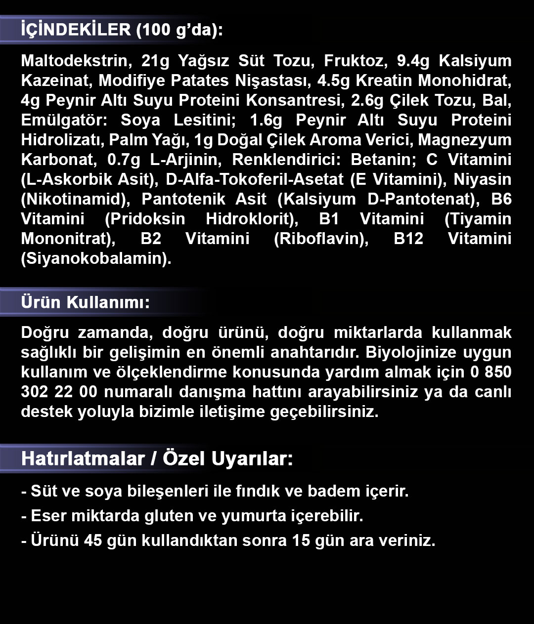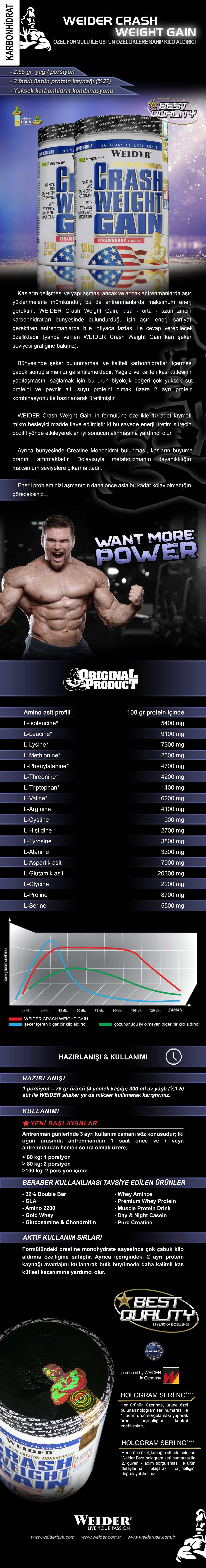 WEIDER Crash Weight Gain, yapısında bulunan kısa, orta ve uzun zincirli karbonhidratlar ile antrenmanlardaki aşırı yüklenmeler için enerji sağlayan, dengeli bir beslenme programı ve düzenli antrenmanlarla desteklendiğinde, yağlanmadan kilo alınmasına yardımcı olan bir karbonhidrat kombinasyonudur. WEIDER Crash Weight Gain ayrıca formülüne eklenen 3 gram / porsiyon kreatin sayesinde kas hücre içi suyunu artırarak bulk büyümeyi destekler, 1000 mg/ porsiyon L-Arjinin ile de daha yoğun ve daha yüksek performanslı antrenmanlar çıkarılmasına yardımcı olur.